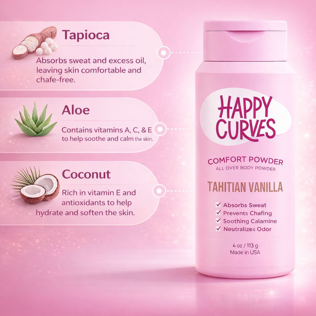 Opaline's Happy Curves Comfort Powder is not made for one problem. It works wherever your body needs it most, whether that is your inner thighs, under your breasts, around your belly, or anywhere skin meets skin.