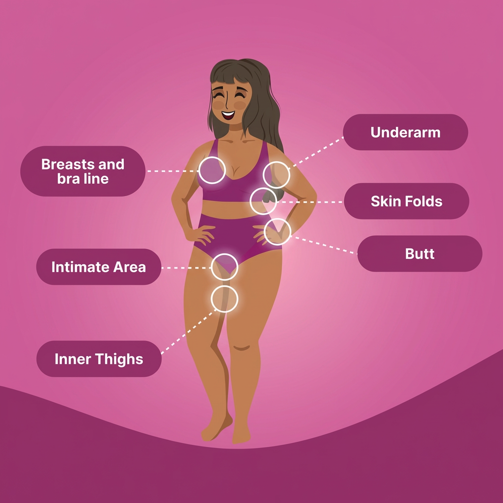 Anywhere that rubs, sweats, or chafes. Under your breasts, inner thighs, belly folds, underarms, and intimate areas. It is safe for your most sensitive skin and designed to go wherever you need it most.